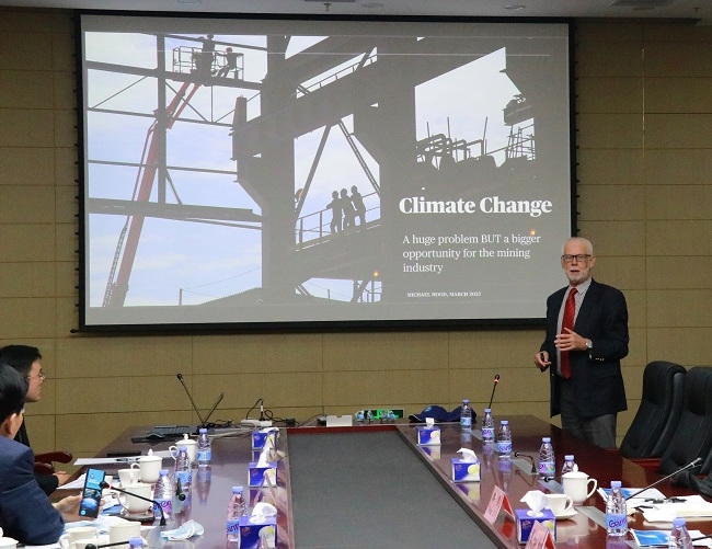 Michael Hood院士参观了bbin展厅,并作了题为“Climate Change-A huge problem but a bigger opportunity for the mining industry”的报告,系统阐述了世界碳排放现状、影响碳排放量因素、未来矿业与新能源发展趋势和减碳途径。Michael Hood院士对bbin的创新成果表示肯定,希望加强合作交流,并邀请有关专家参加第26届世界采矿大会。