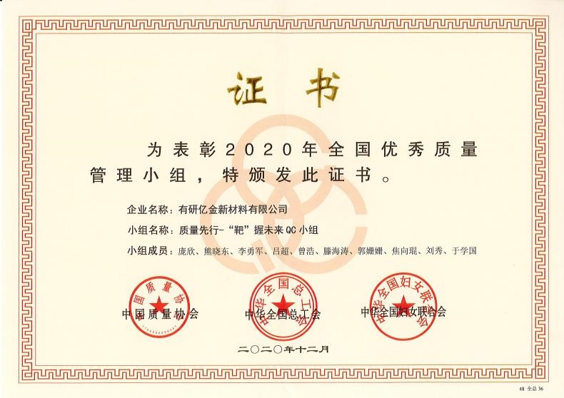 喜报!有研亿金荣获“2020年全国优秀质量管理小组”