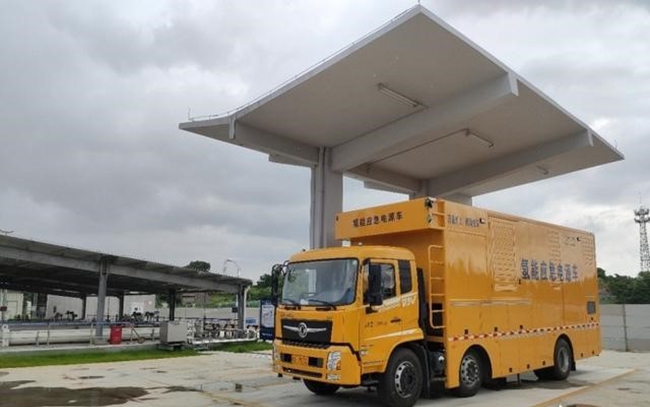 氢能应急电源车使用的固态储氢系统可存储100kg氢气,体积储氢密度达到国内领先水平,通过为搭载的4个50kW额定功率质子交换膜燃料电池供氢,可使燃料电池在200kW功率下持续供电6小时。