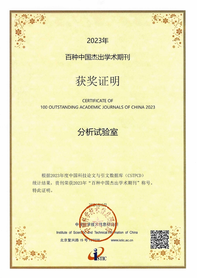 《分析试验室》获评2023年度“百种中国杰出学术期刊”