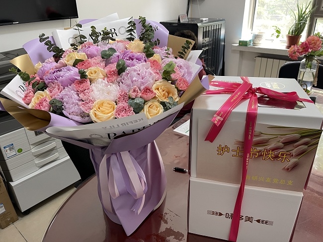 5月12日是第111个国际护士节,有研兴友副总经理张景怀、张福萍一行带着鲜花与礼物前往有研卫生站,向疫情之下坚守在工作岗位的医护人员送上节日的问候。
