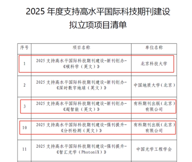 5月30日,北京市科学技术委员会、中关村科技园区管理委员会发布《关于公示2025年度支持高水平国际科技期刊建设拟立项项目的通知》,有科出版旗下期刊3项入选。其中与北京科技大学合作创办的《碳科学(英文)》新刊、与中国航天科技创新研究院合作创办的《超智能(英文)》入选新刊创办项目,《分析检测(英文)》入选强刊提升项目。