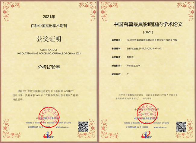 2022年12月29日,中国科学技术信息研究所发布了2021年度中国科技论文统计结果,《分析试验室》蝉联四届“百种中国杰出学术期刊”荣誉称号(共获5次),综合评价总分在冶金工程学科排名第一;所刊发论文《(6,5)手性单壁碳纳米管近红外荧光探针检测多巴胺》入选“中国百篇最具影响国内学术论文”。《分析试验室》继2021年被美国工程索引(EI)收录之后再创佳绩。
