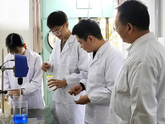 有研重冶总经理助理张敬国(右一)和公司的年轻人们正在做实验