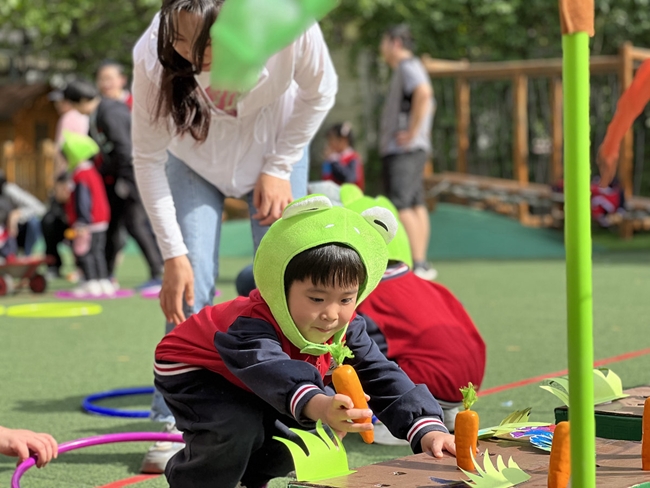 小班则是好玩的亲子运动会。结合小班幼儿的年龄特点,有研幼儿园设计了《母鸡下蛋》《给小兔子送萝卜》《猫和老鼠》《围裙接球》等趣味性、互动性强的亲子运动游戏;在体验运动带来快乐的同时,既增进了幼儿与同伴彼此之间的友谊,更增强了幼儿与家长之间的情感交流。小运动员们和爸爸妈妈们一起互动游戏,大家在欢声笑语中享受着幸福的亲子时光。