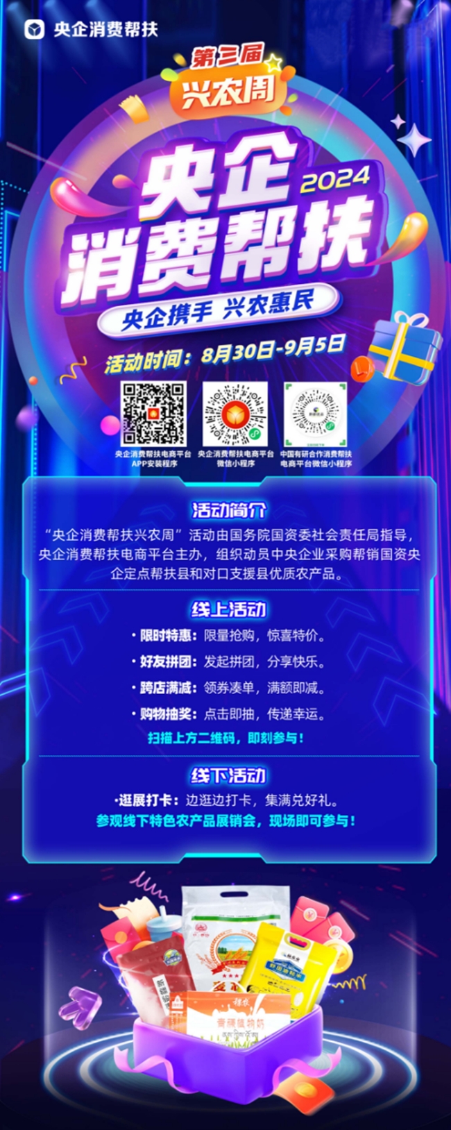 “央企消费帮扶兴农周”由国务院国资委社会责任局指导,央企消费帮扶电商平台(国网数字科技控股有限公司)主办,国务院国资委机关服务管理局、国务院国资委bbin、国网北京市电力公司、各中央企业电商平台联合协办。