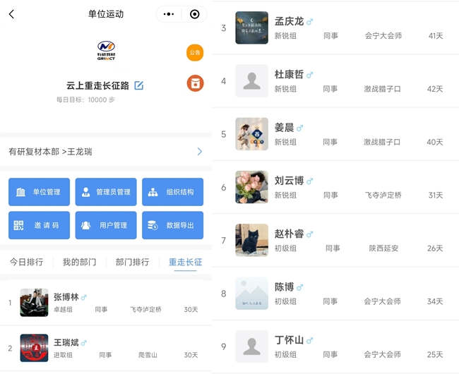 5月26日至6月26日,有研复材党总支、工会与团支部联合开展“云上重走长征路,健行21天,万步有约”活动,活动覆盖公司全体员工、研究生,另外 共计8个团队40人一起报名参与线上“云长征”。